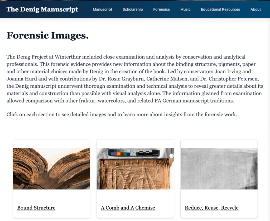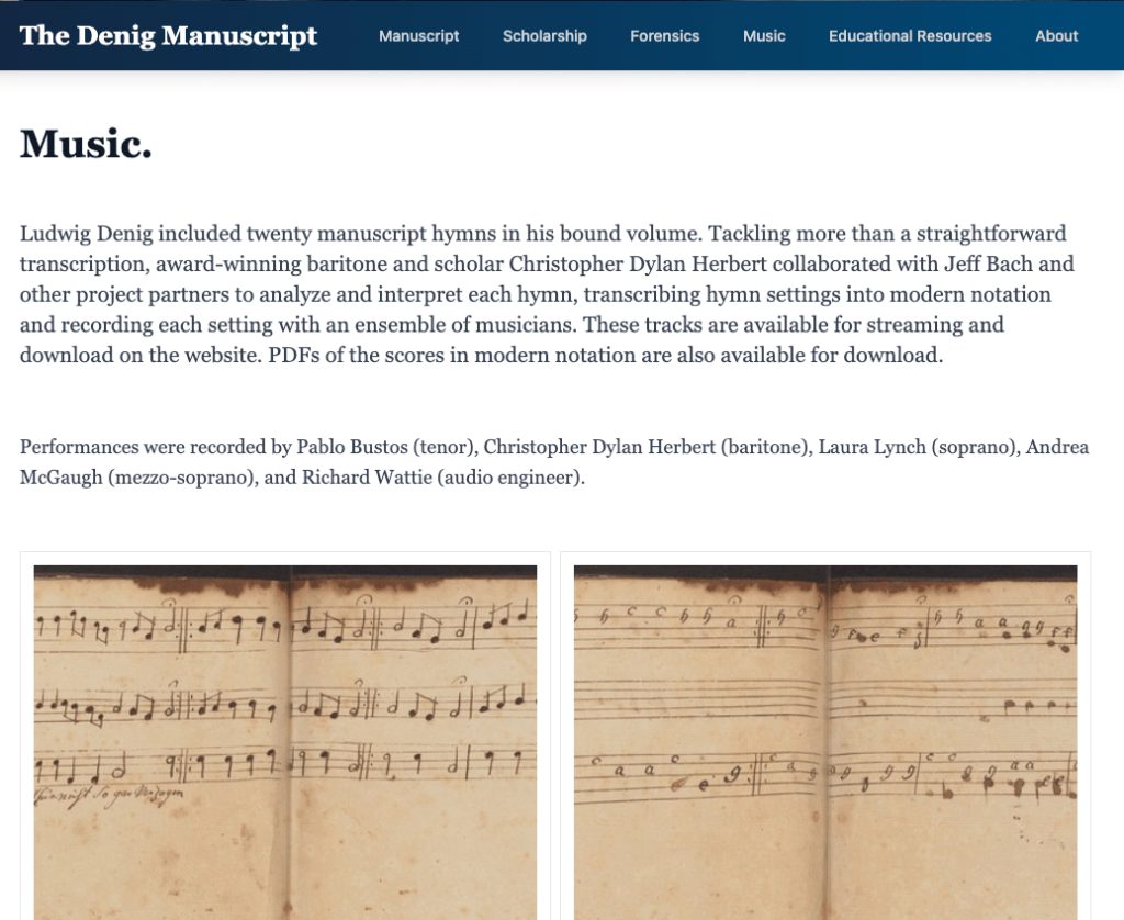 The website is easy to navigate and does not require previous knowledge of navigating academic websites and archives. With its ease of use and functionality, The Denig Manuscript is easy to understand and follow. Having separate pages dedicated to the forensics of the manuscript (such as binding, x-rays of pages, and color analysis of the document), as well as a music section where the user can experience both the visual of historical music sheets with the music being played within the page, is extremely unique.