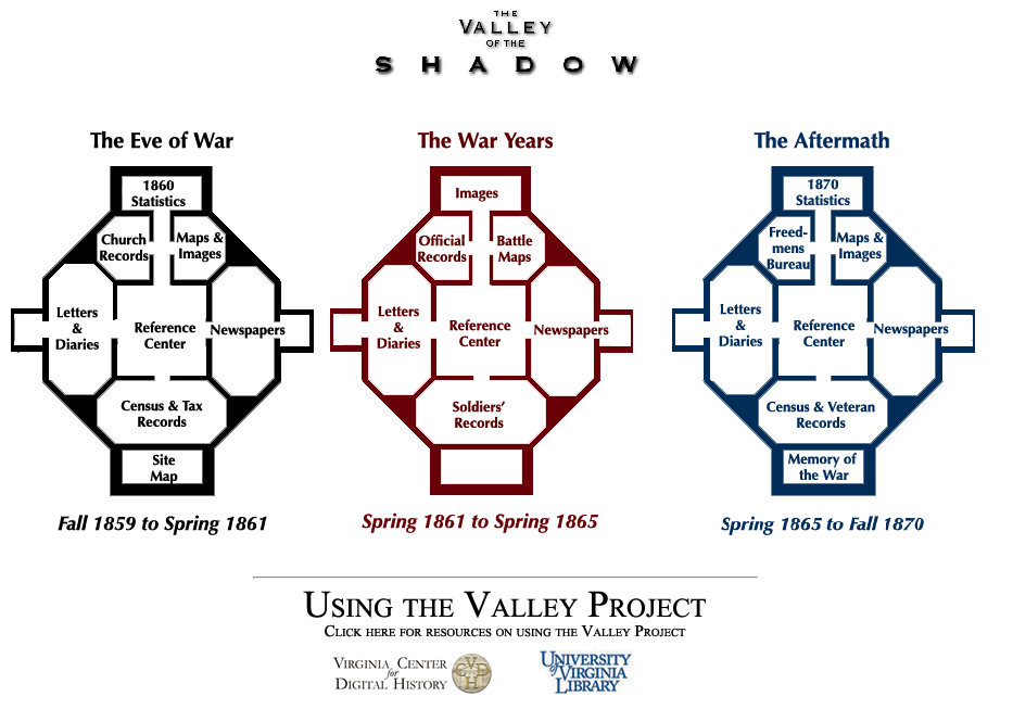 The World Wide Web, otherwise known as Web 1.0, was created in 1991 and would change the course of historical research forever. A website or database created during the era of Web 1.0 can be identified by the use of hypertext (hyperlinks). An example of this can be found in The Valley of the Shadow database (shown in the picture).