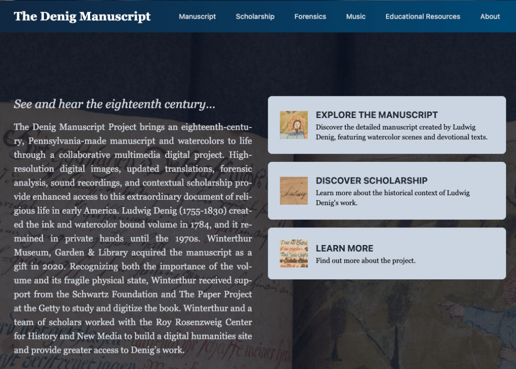 The Denig Manuscript was created by Ludwig Denig (1755-1830) and looks at devotional, theological, and artistic traditions of revolutionary Pennsylvania. While the manuscript is physically held in the Winterthur Museum but can be accessed through the website.